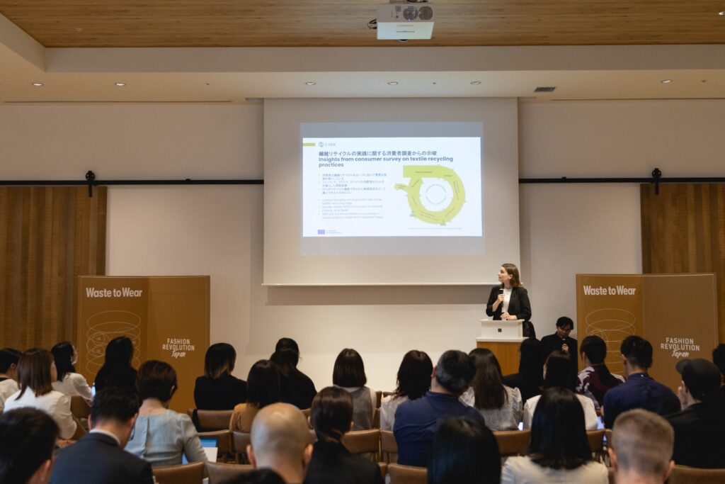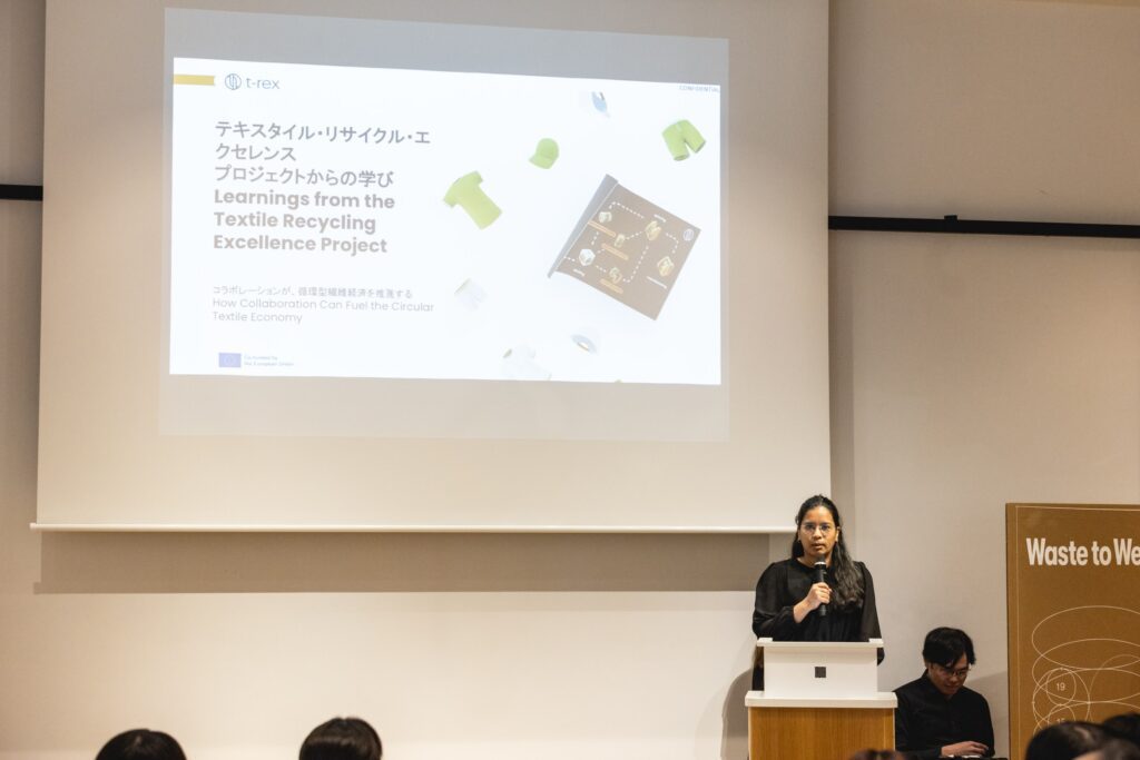 On April 25, 2025, T-REX Project consortium members Anubhuti Bhatnagar and Elina Lewe from Aalto University had the opportunity to give a keynote speech at Fashion Revolution’s “Waste to Wear” symposium in Tokyo. The event brought together a wide range of voices from across Japan’s fashion and textile sectors to talk about one of the biggest challenges we face: how to stop end-of-use clothing from becoming waste.