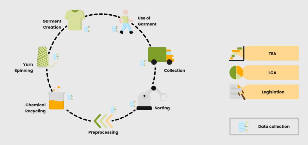 We are also proud to showcase demonstrator products which have been created through the successful implementation of the entire recycling process for polyester, polyamide 6, and cellulosic materials within Europe.
